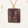 Der Anhänger ist aus Oberflächenmustern für die Holzindustrie upcycled. Ich schlachte nicht mehr gebrauchte Musterbücher aus und entnehme die einzelnen Farb- & Struktursamples. Darauf wird in zarten Mustern feinstes Messingpigment (sog. „Reichsgold“) aufgestreut und anschließend mit einer Schicht Gießharz versiegelt, die mit Hilfe der “Doming-Technik” vorsichtig aufgetragen wird. Durch das Harz werden die Farben besonders hervorgehoben. Größere Musterplättchen werden von mir in anderen Kunstprojekten verwendet. Die Rückseite ist mit Kupfertape beklebt, das dem extrem leichten Anhänger ein wenig mehr Eigengewicht gibt.