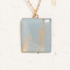 Der Anhänger ist aus Oberflächenmustern für die Holzindustrie upcycled. Ich schlachte nicht mehr gebrauchte Musterbücher aus und entnehme die einzelnen Farb- & Struktursamples. Darauf wird in zarten Mustern feinstes Messingpigment (sog. „Reichsgold“) aufgestreut und anschließend mit einer Schicht Gießharz versiegelt, die mit Hilfe der “Doming-Technik” vorsichtig aufgetragen wird. Durch das Harz werden die Farben besonders hervorgehoben. Größere Musterplättchen werden von mir in anderen Kunstprojekten verwendet. Die Rückseite ist mit Kupfertape beklebt, das dem extrem leichten Anhänger ein wenig mehr Eigengewicht gibt.