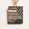 Der Anhänger ist aus Oberflächenmustern für die Holzindustrie upcycled. Ich schlachte nicht mehr gebrauchte Musterbücher aus und entnehme die einzelnen Farb- & Struktursamples. Diese werden dann von mir mit Acrylfarbe und Messingpigment bemalt und anschließend mit einer Schicht Gießharz versiegelt, die mit Hilfe der “Doming-Technik” vorsichtig aufgetragen wird. Durch das Harz werden die Farben besonders hervorgehoben. Größere Musterplättchen werden von mir in anderen Kunstprojekten verwendet. Die Rückseite ist mit Kupfertape beklebt, das dem extrem leichten Anhänger ein wenig mehr Eigengewicht gibt.