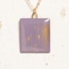 Der Anhänger ist aus Oberflächenmustern für die Holzindustrie upcycled. Ich schlachte nicht mehr gebrauchte Musterbücher aus und entnehme die einzelnen Farb- & Struktursamples. Darauf wird in zarten Mustern feinstes Messingpigment (sog. „Reichsgold“) aufgestreut und anschließend mit einer Schicht Gießharz versiegelt, die mit Hilfe der “Doming-Technik” vorsichtig aufgetragen wird. Durch das Harz werden die Farben besonders hervorgehoben. Größere Musterplättchen werden von mir in anderen Kunstprojekten verwendet. Die Rückseite ist mit Kupfertape beklebt, das dem extrem leichten Anhänger ein wenig mehr Eigengewicht gibt.